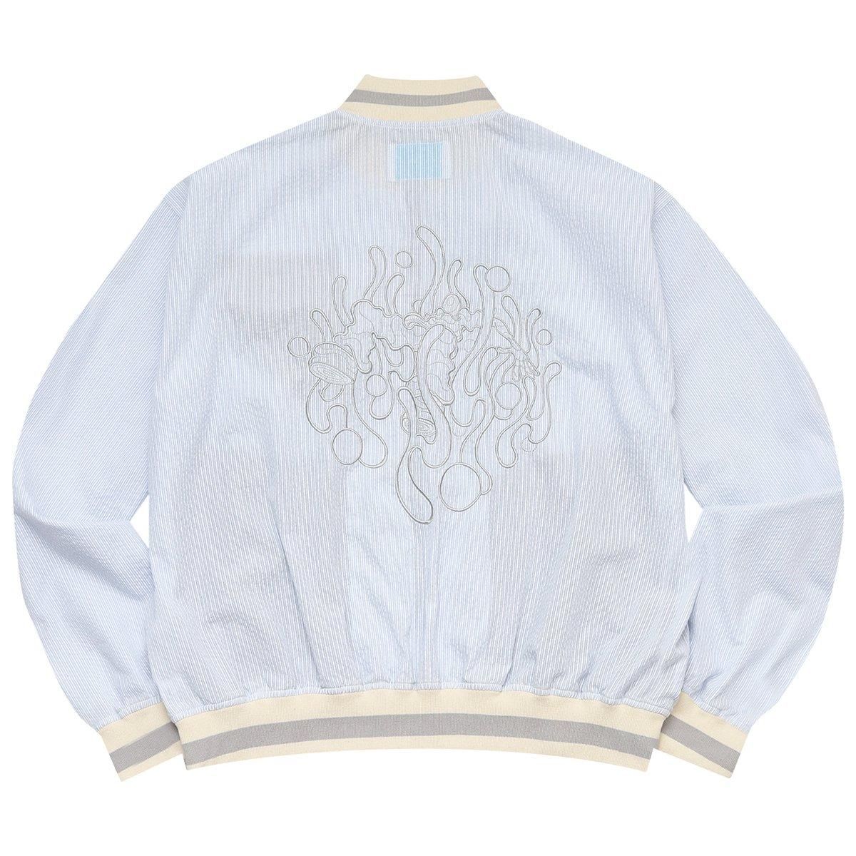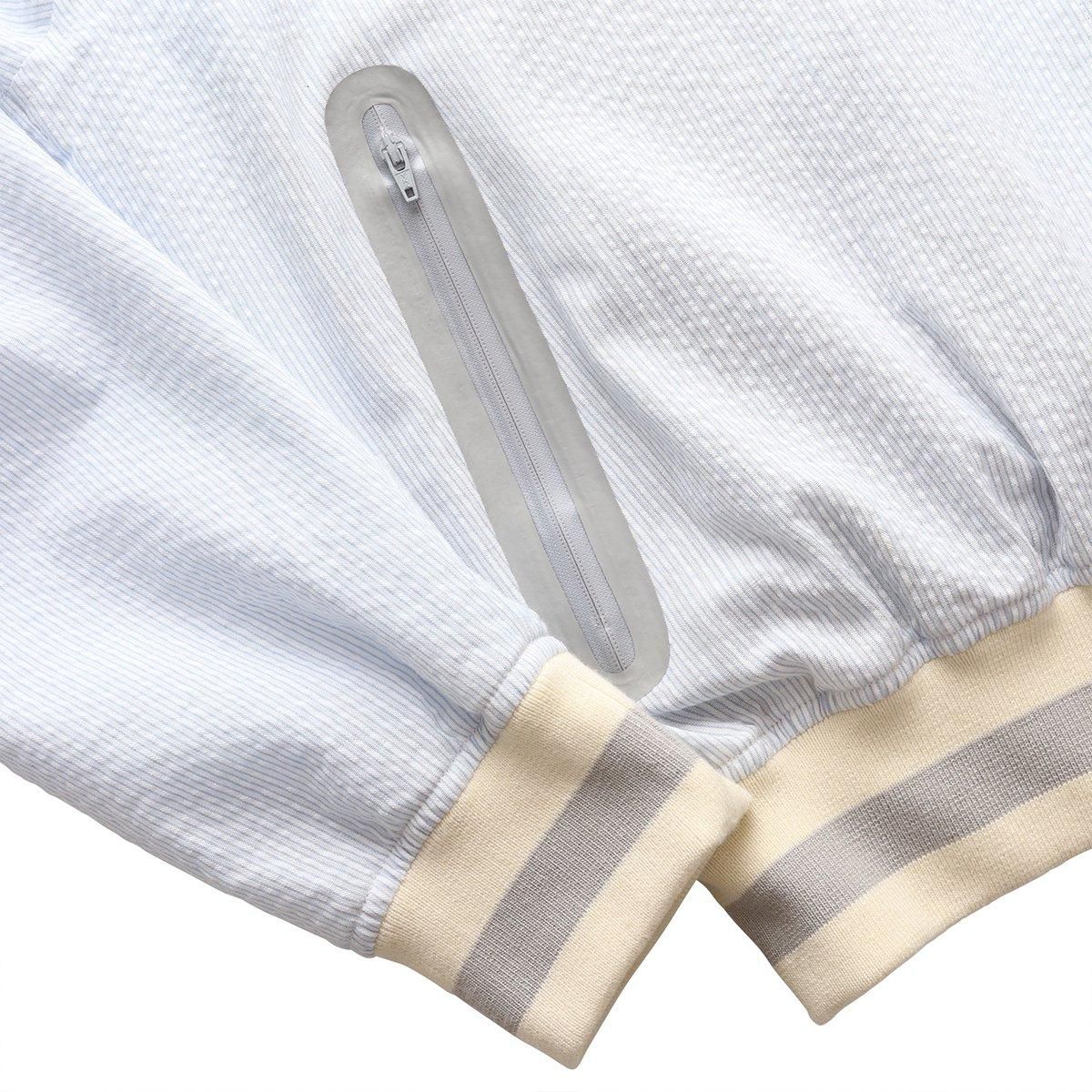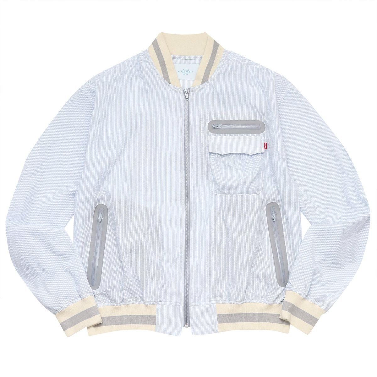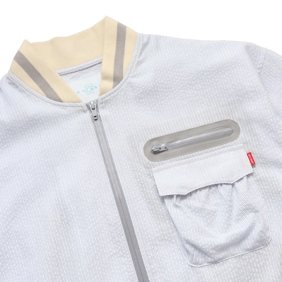 シアサッカー生地にニットリブ、クラシカルな組み合わせのスイングトップには、止水ジッパーが随所に使用されポケットの袋布までメッシュ素材。このパーツ選択の違和感は生地に施した撥水加工で完結。見た目の面白さに町で過ごすことへの仮説が成立しています。
