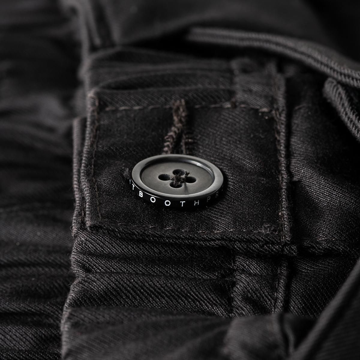バックの右腰部分にはロゴ入りのヌバック風パッチ付きで、ボタンもロゴ入りのものを使用。