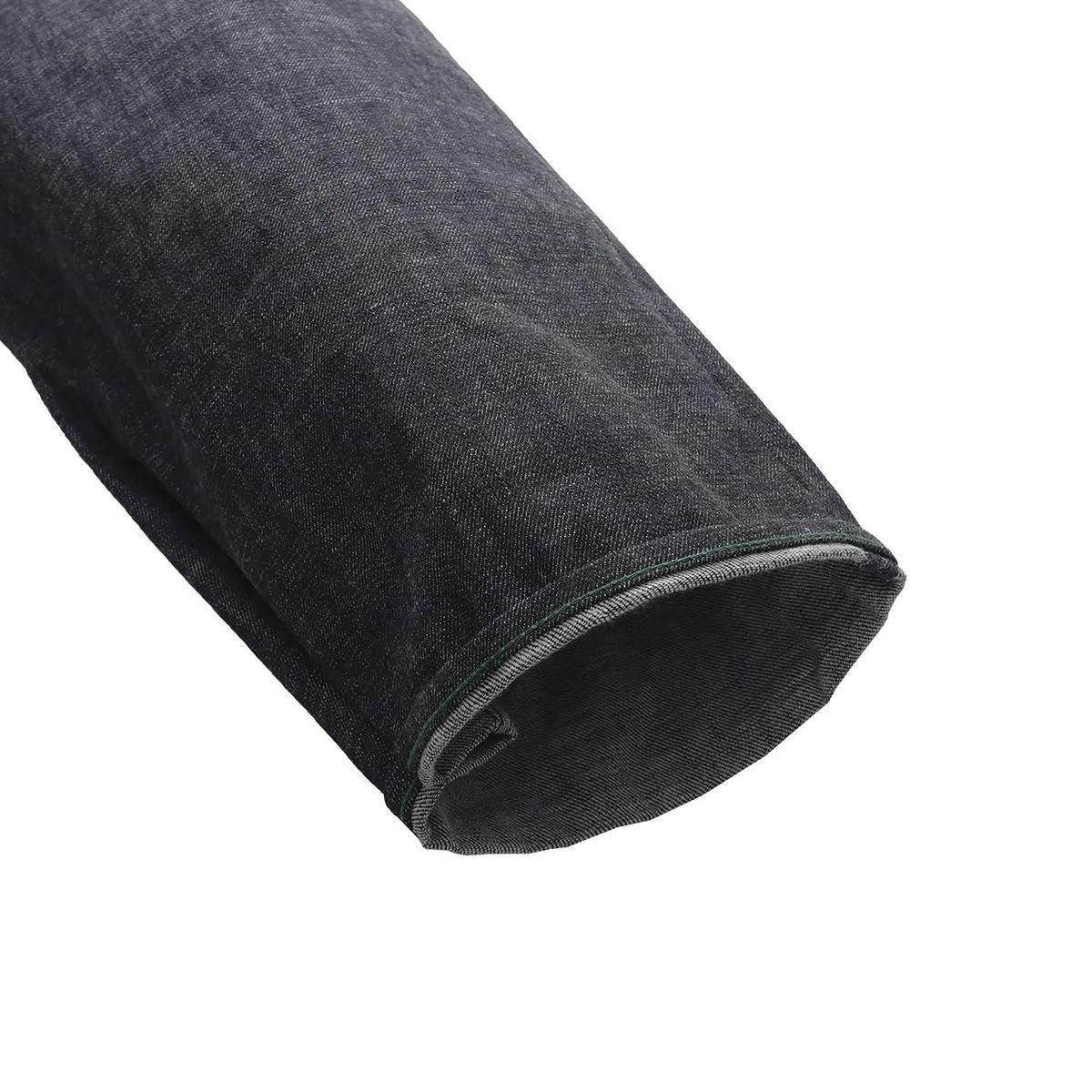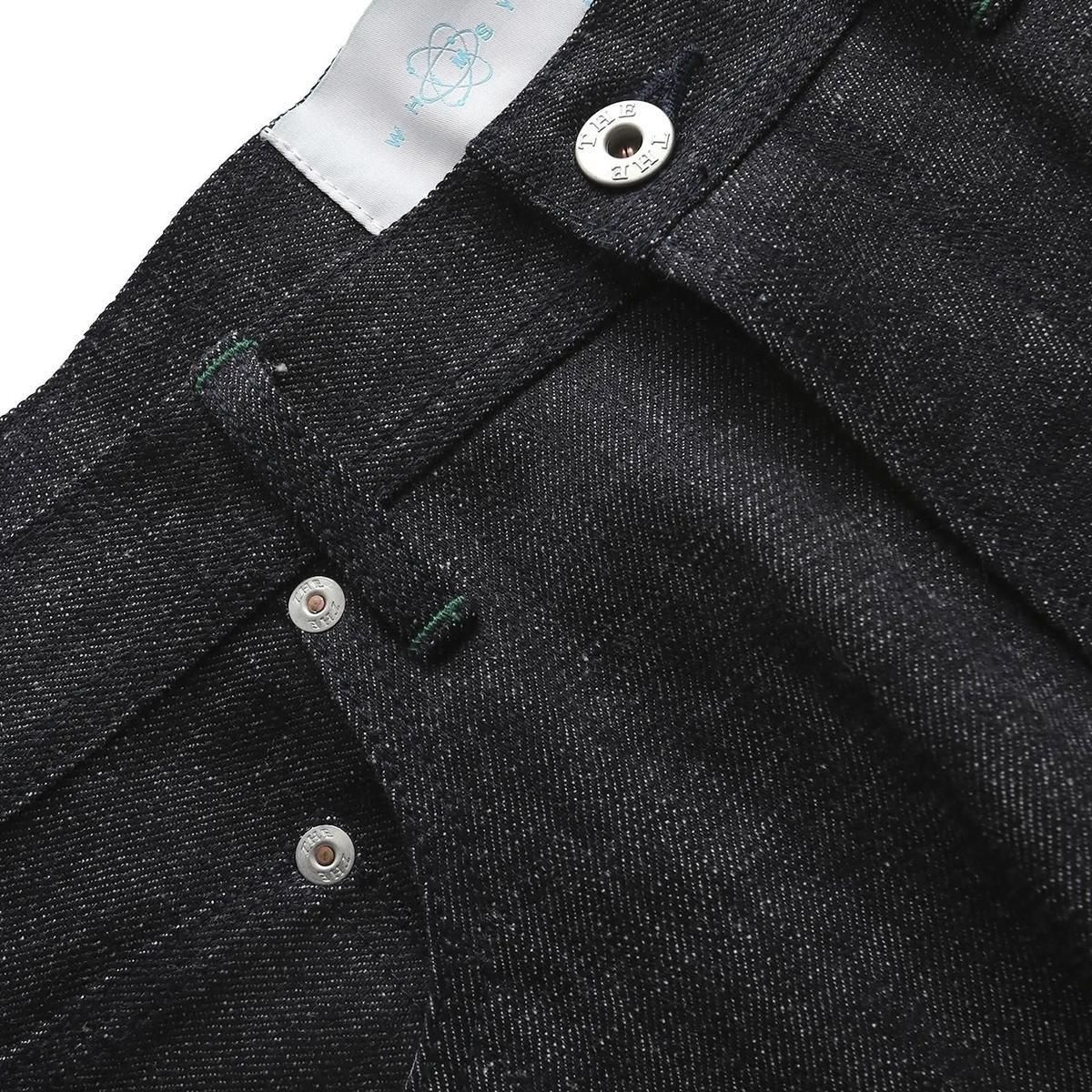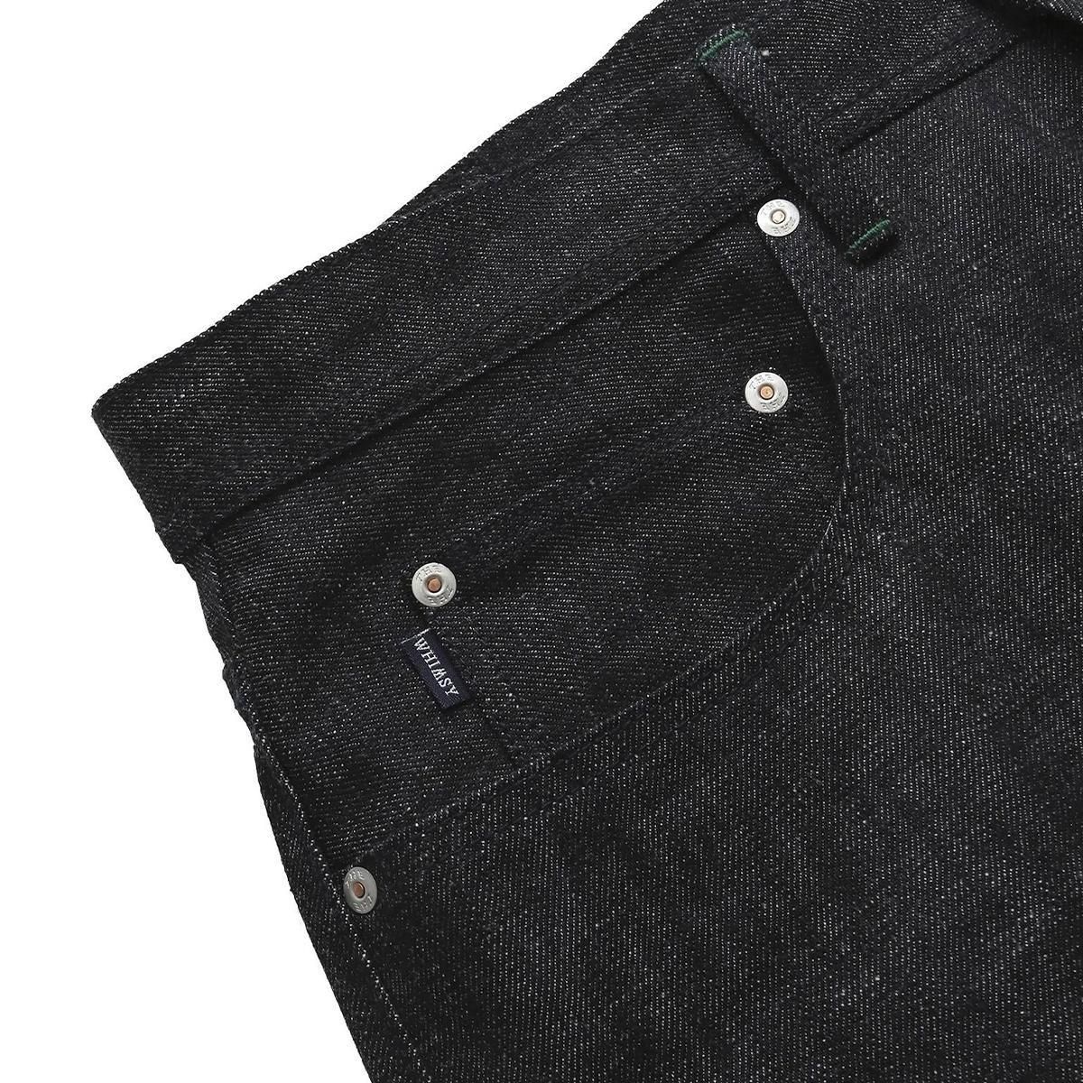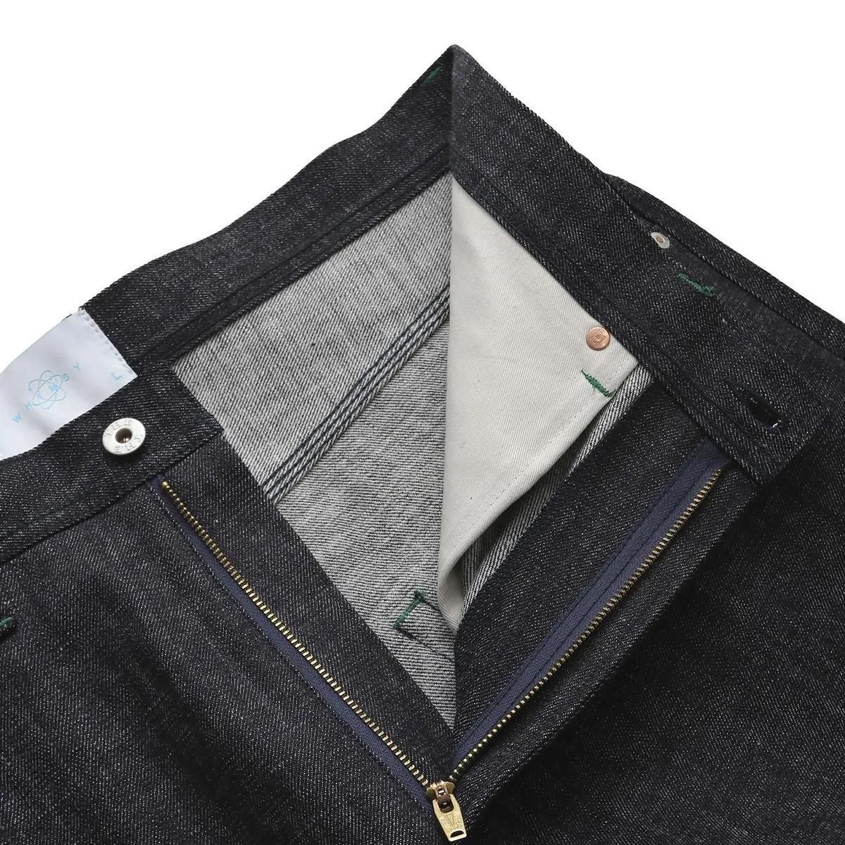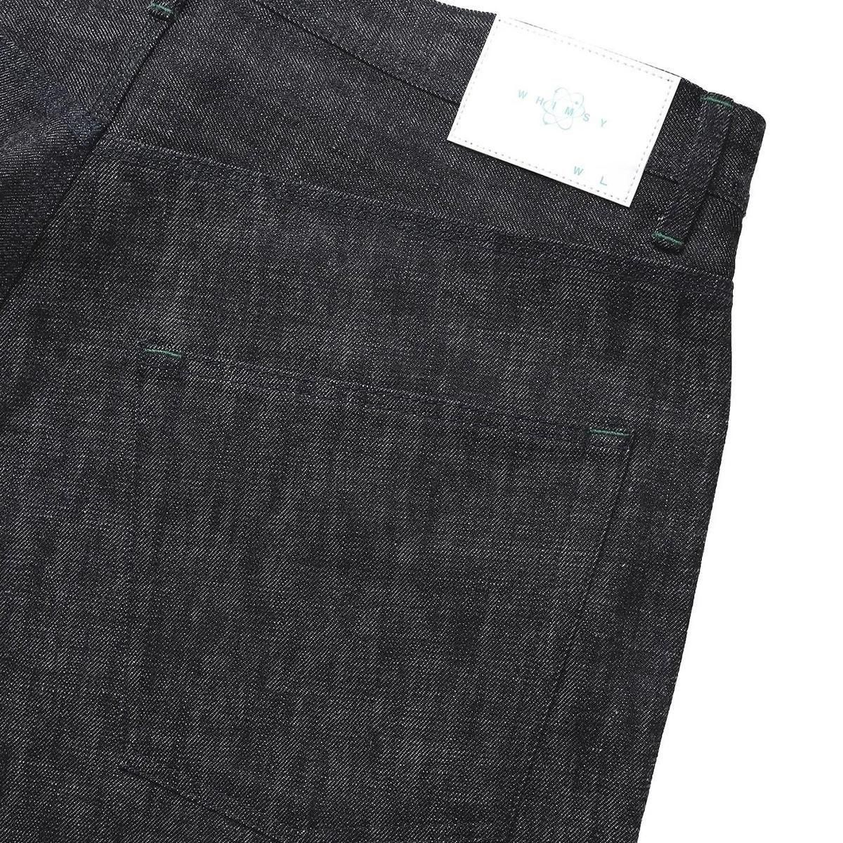 チャックテイラーのようなスニーカーにバギーシルエットのパンツを合わせた時にパンツが地面に擦れることを避ける為に裾を手縫いで絞る事を思いついた。それによりテーパードをしたパンツには出せないシルエットを実現した。生産はTHE UNIONメイド。彼らのクラフトマンシップによって風格あるWHIMSYのデニムが完成。