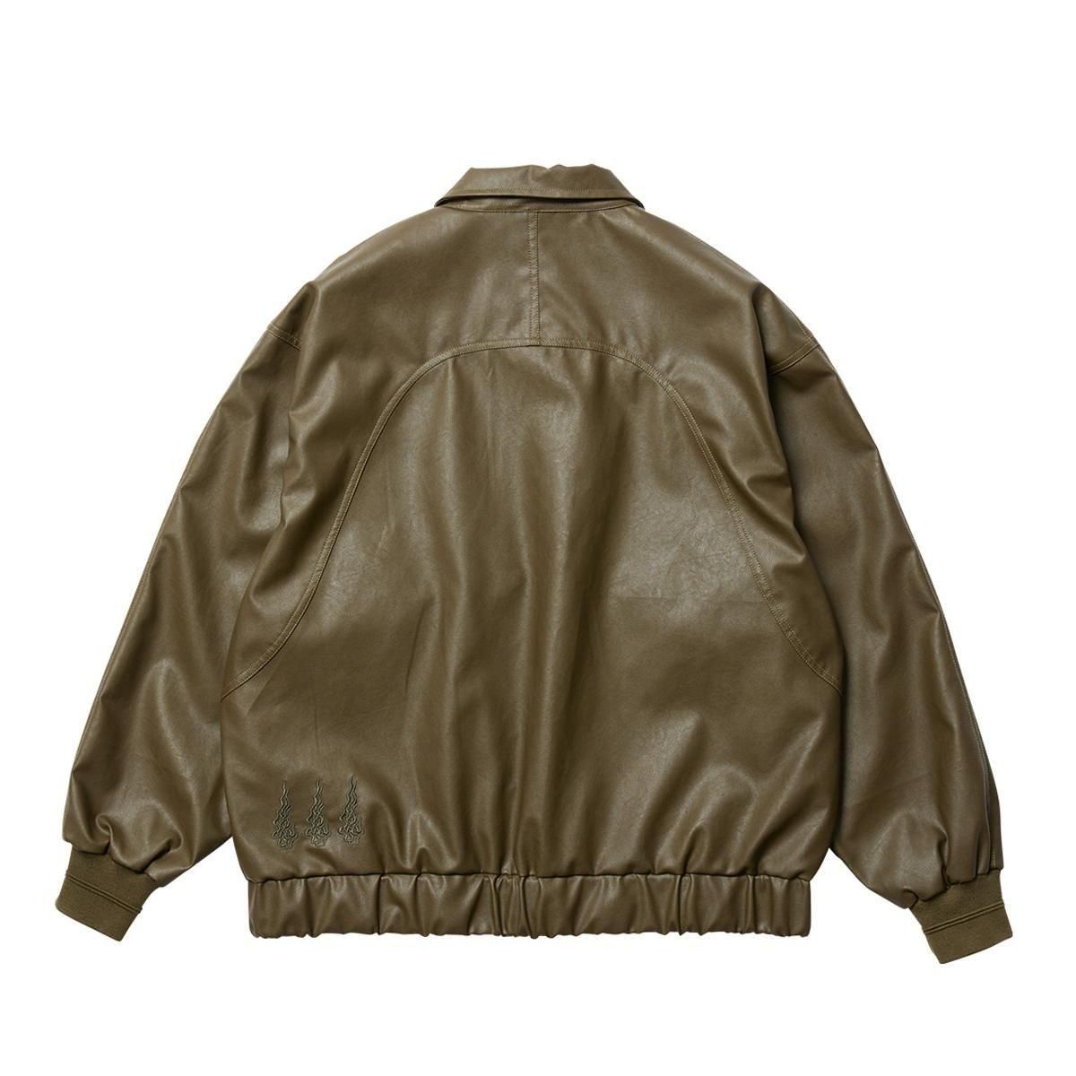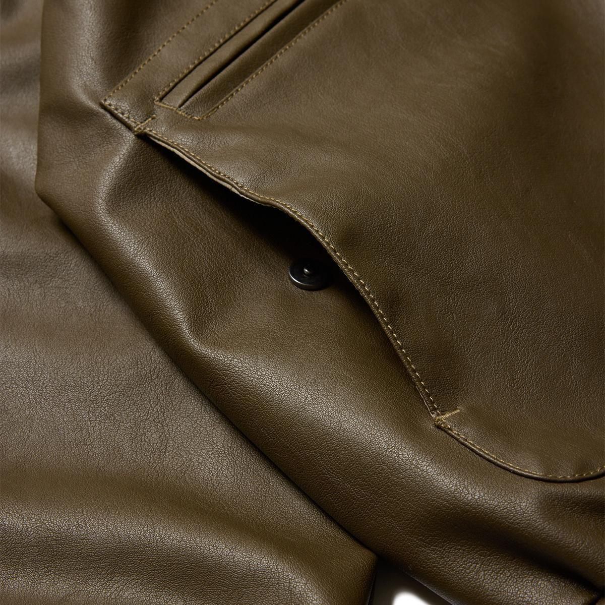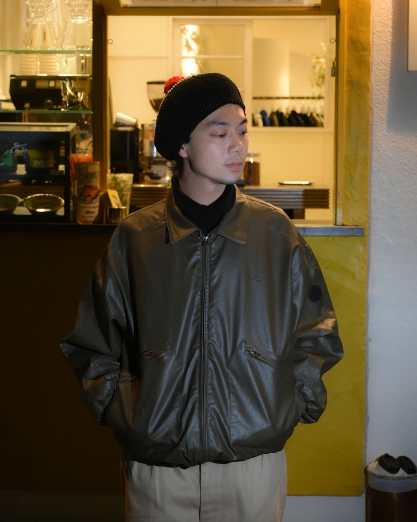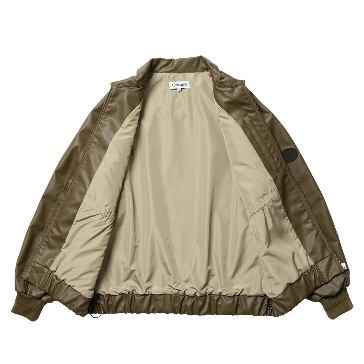 シボ加工が落ち着いた印象の扱いやすい合成皮革を使用したブルゾン。襟先にマグネット内蔵のため、襟を立てたスタンドカラースタイルでも着られます。フロントオープニングはシングルファスナー仕様。左胸にEロゴ刺繍入り。左右の腰ポケットはファスナーポケットとハンドウォーマースラッシュポケットのダブルレイヤー仕様です。右ポケットにはEvisenメタルプレート付き。後ろ身頃は曲線デザインが効いた3パネル仕様で、左下にEye Fire刺繍入り。身頃内側には左右にインナーポケット、左胸に貴重品などの収納に便利なファスナーポケットを搭載しています。袖口はリブ仕様で、左袖にはロゴ入りのシリコンワッペンを配置。裾は平ゴムのシャーリング仕様で丸みを帯びたシルエット。