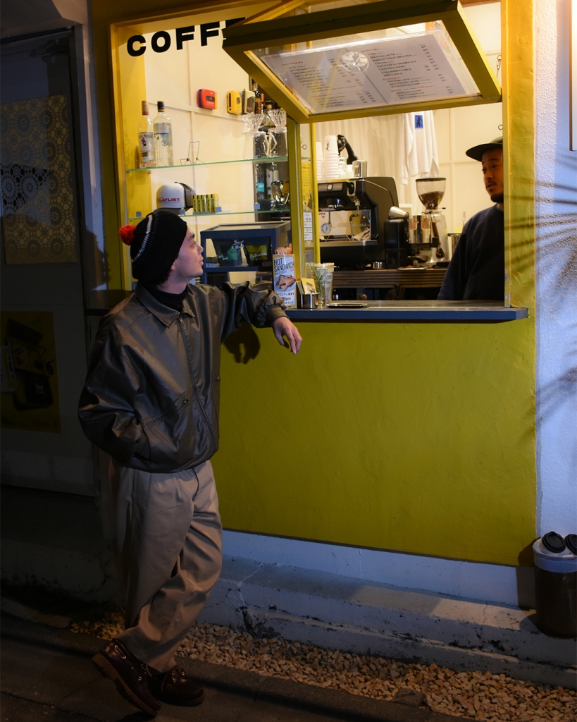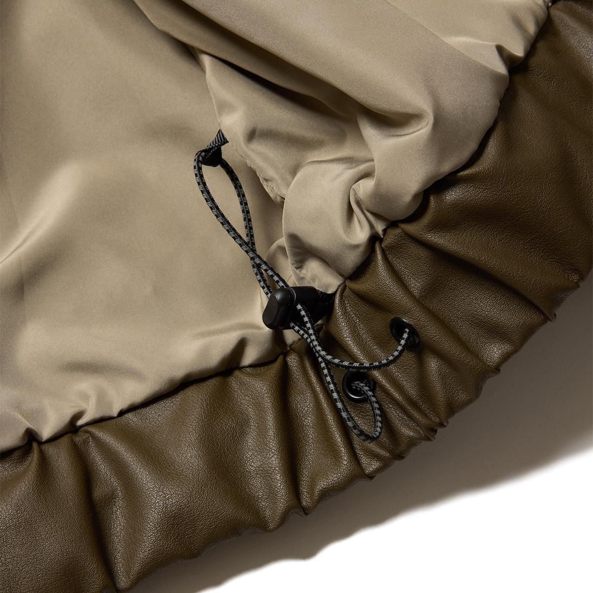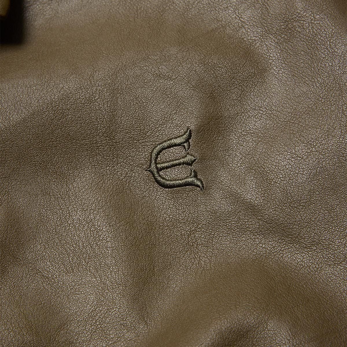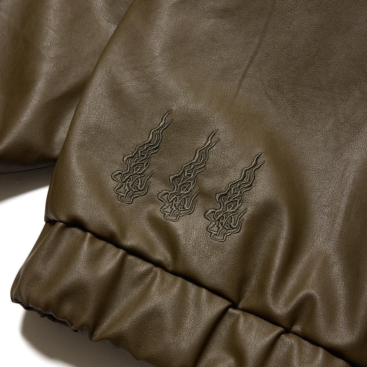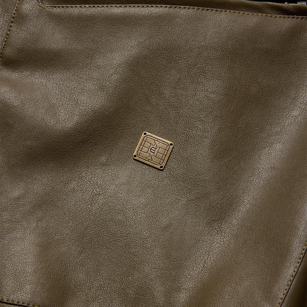 シボ加工が落ち着いた印象の扱いやすい合成皮革を使用したブルゾン。襟先にマグネット内蔵のため、襟を立てたスタンドカラースタイルでも着られます。フロントオープニングはシングルファスナー仕様。左胸にEロゴ刺繍入り。左右の腰ポケットはファスナーポケットとハンドウォーマースラッシュポケットのダブルレイヤー仕様です。右ポケットにはEvisenメタルプレート付き。後ろ身頃は曲線デザインが効いた3パネル仕様で、左下にEye Fire刺繍入り。身頃内側には左右にインナーポケット、左胸に貴重品などの収納に便利なファスナーポケットを搭載しています。袖口はリブ仕様で、左袖にはロゴ入りのシリコンワッペンを配置。裾は平ゴムのシャーリング仕様で丸みを帯びたシルエット。