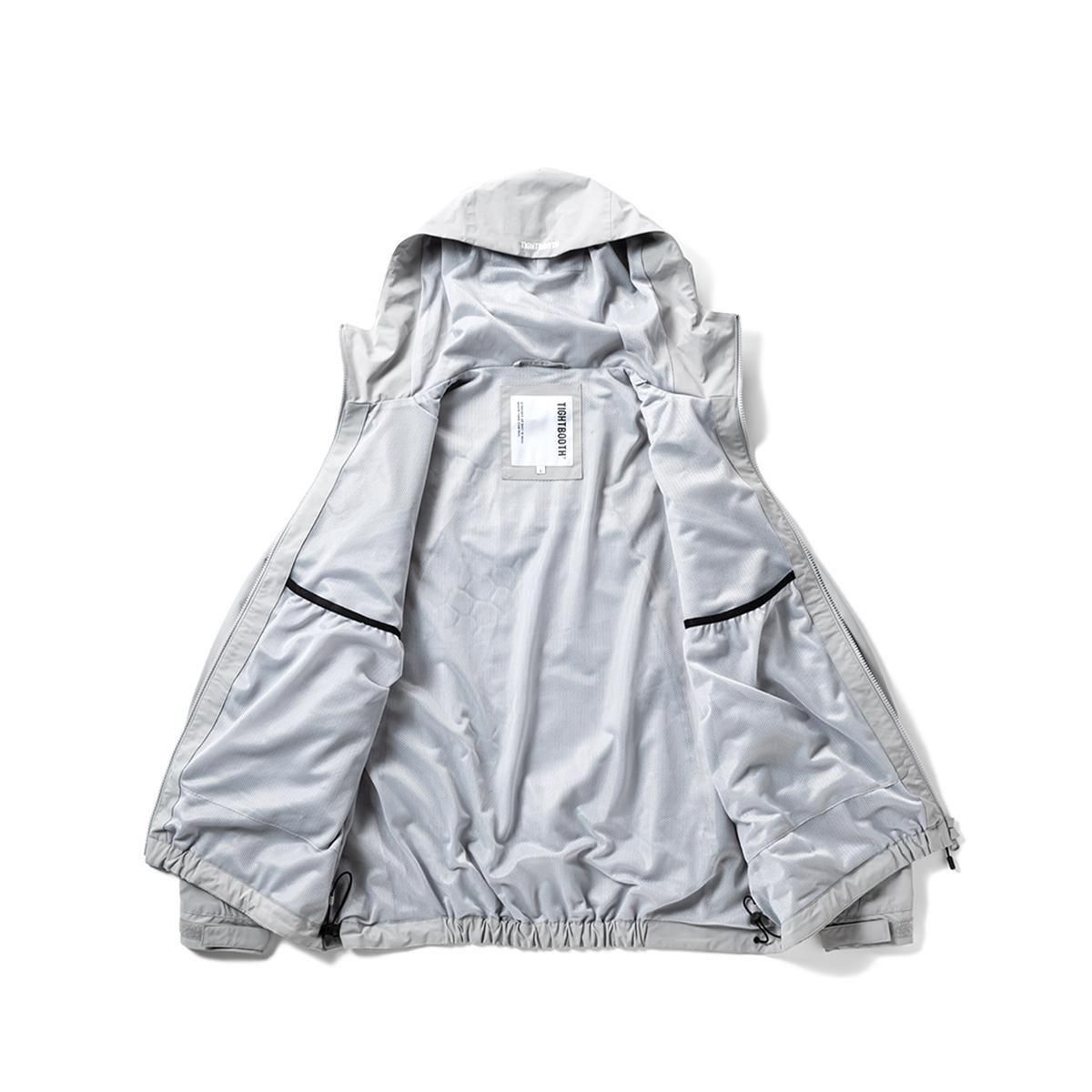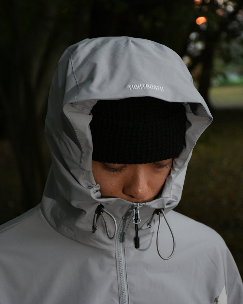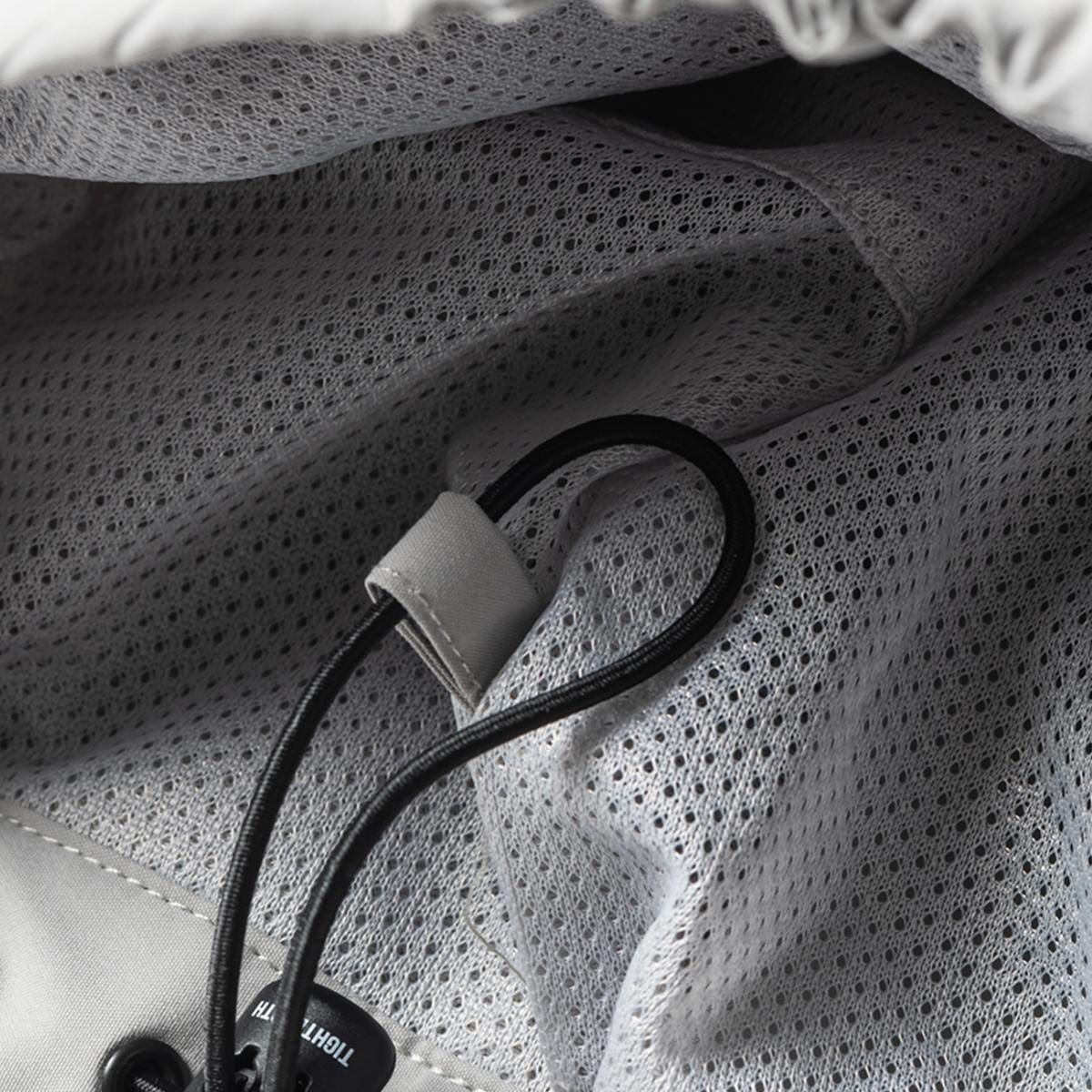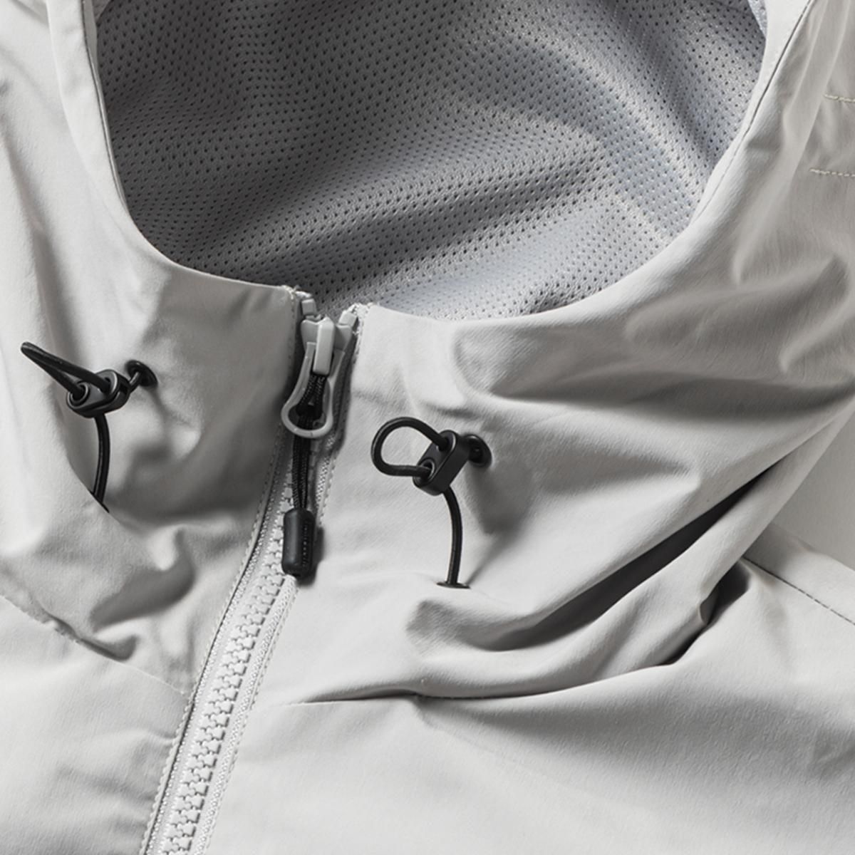 フードには顔まわりだけでなくの後頭部付近にもドローコードを巡らせ細かなフィット感の調整が可能。
