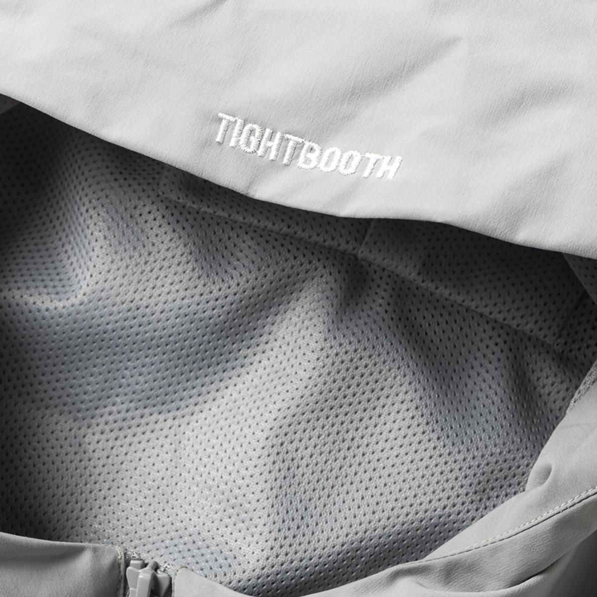 フードのフロント部分にロゴ刺繍、左のアウトシームにオレンジのピスネーム付きで、コードロックや引き手パーツもロゴ入り。