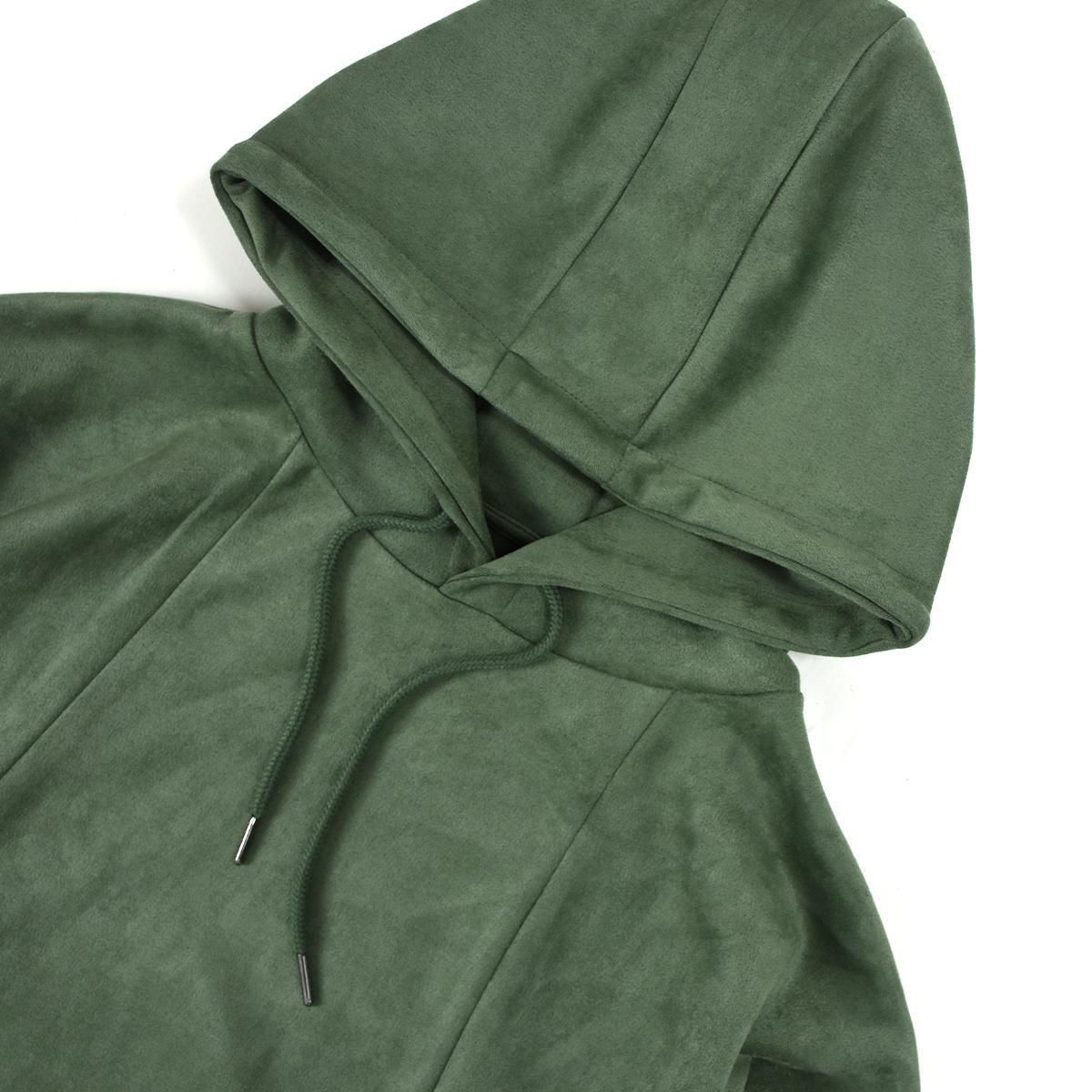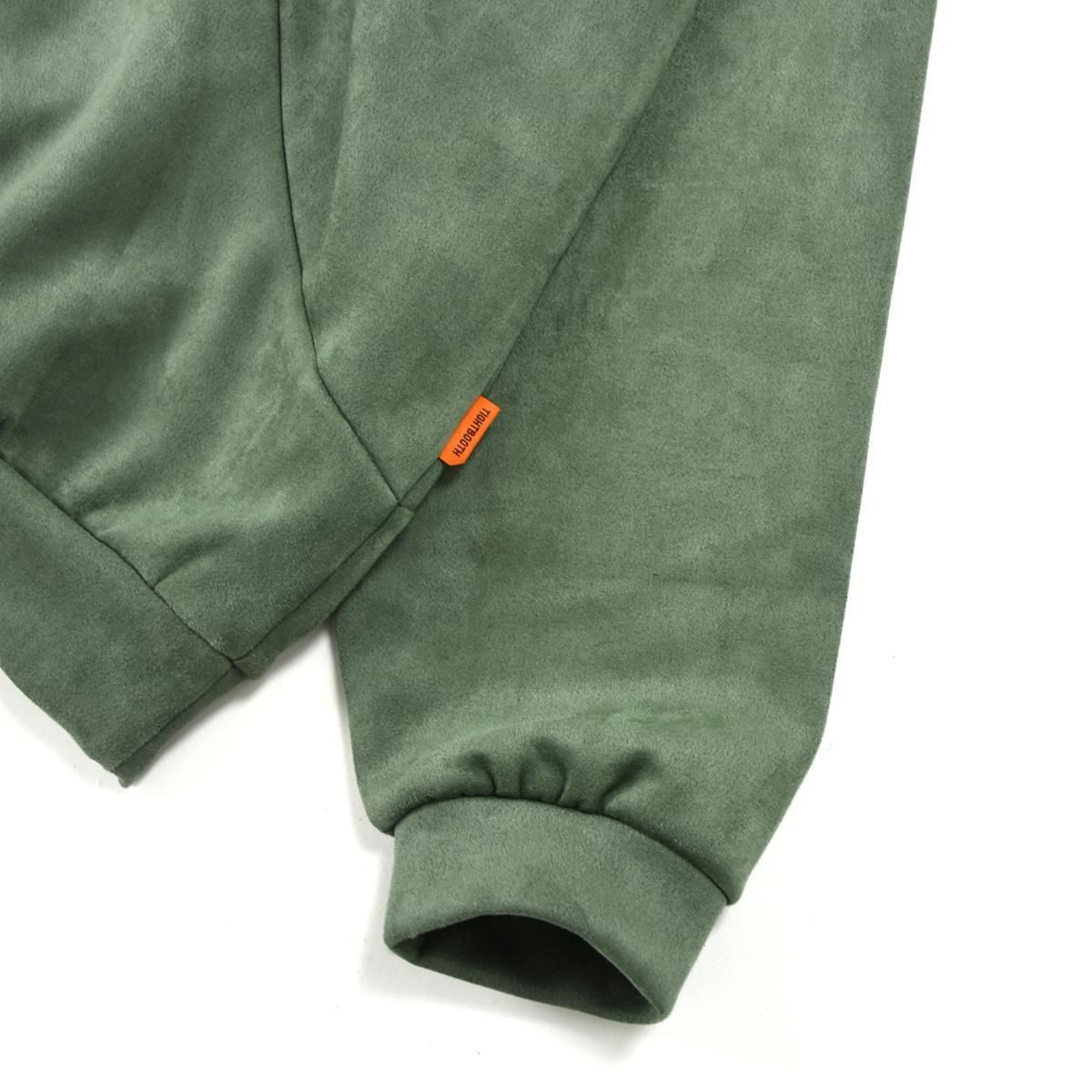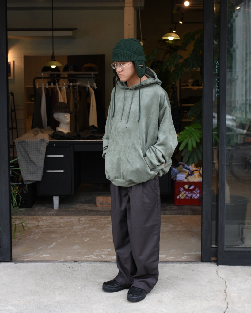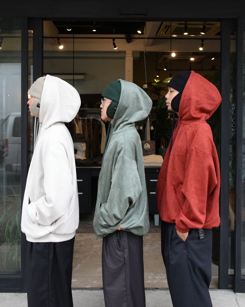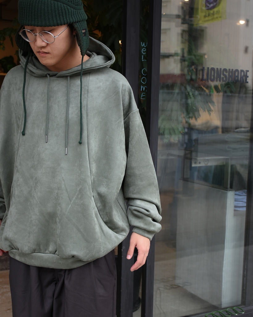 スエード調の質感が特徴的な生地を使用したプルオーバーフーディ。