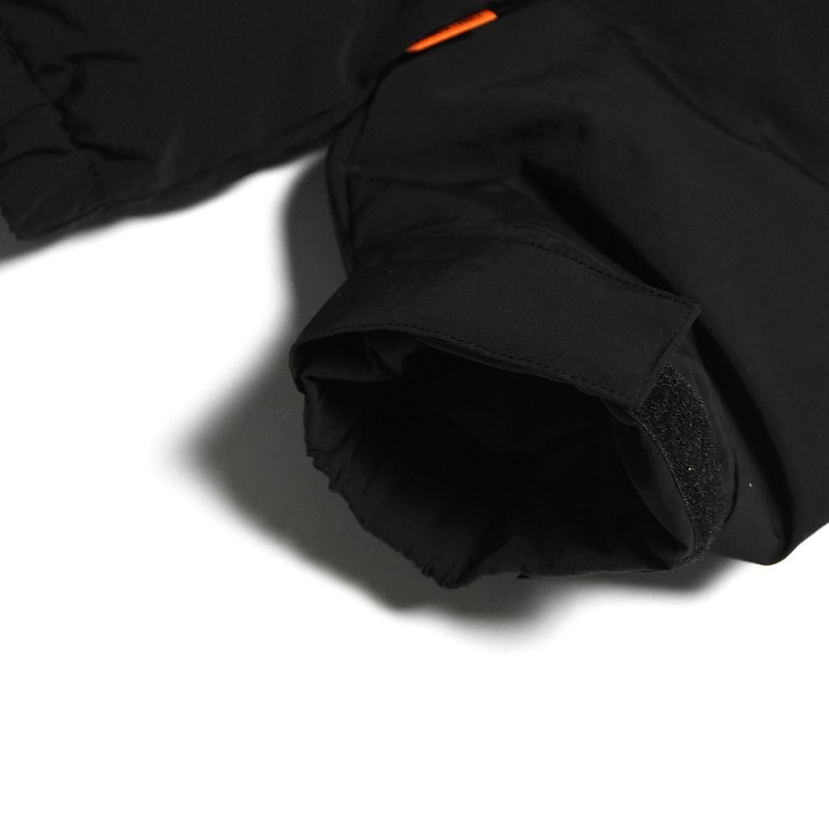 ダブルファスナーのフロントオープニングは上部にのみロゴ刺繍入りのベルクロ前立て付き。