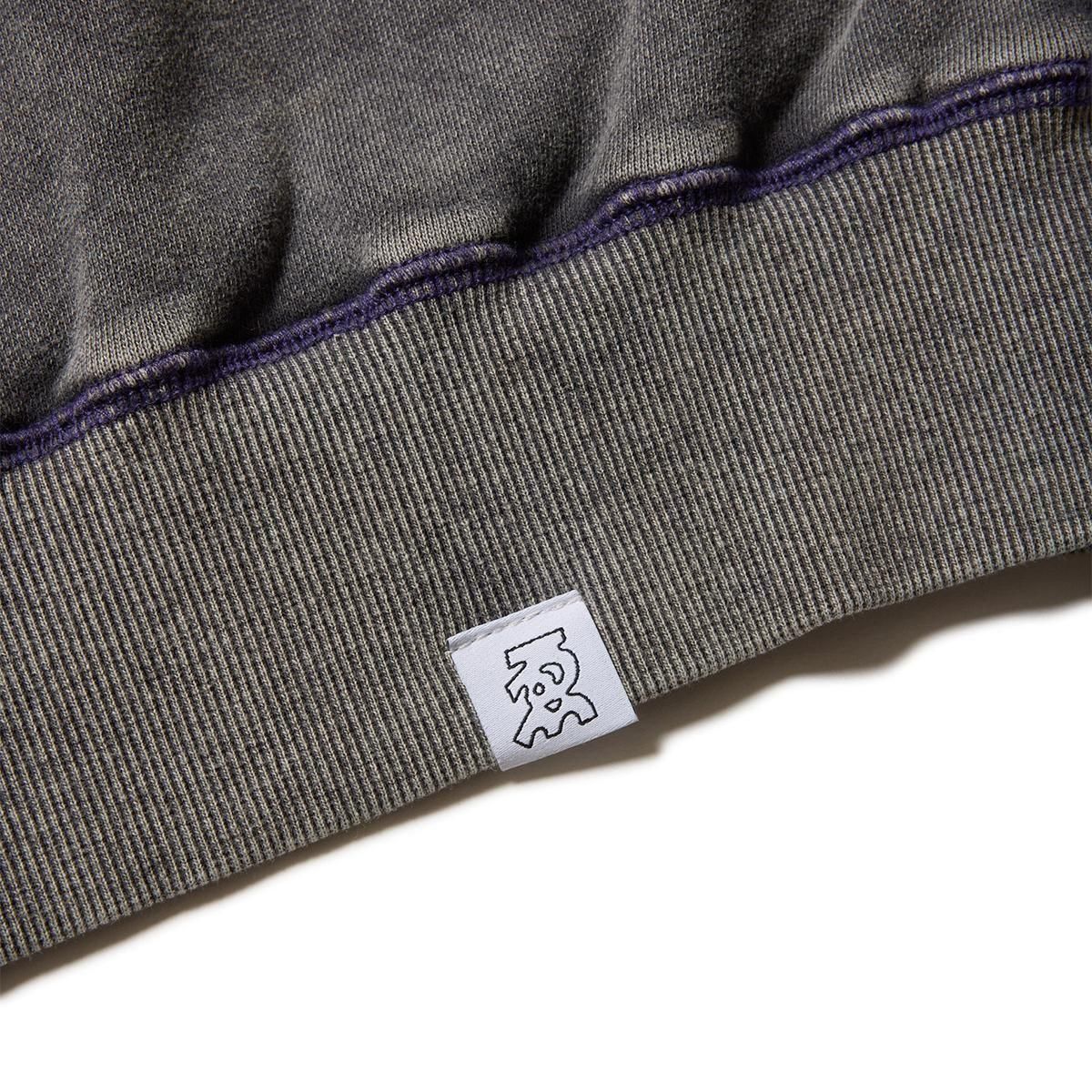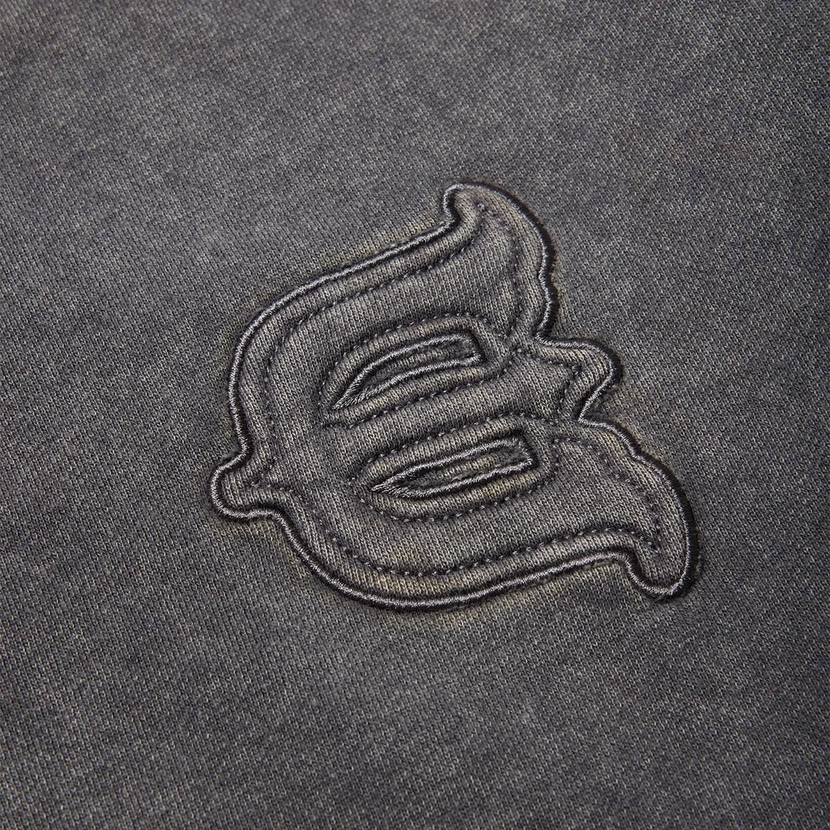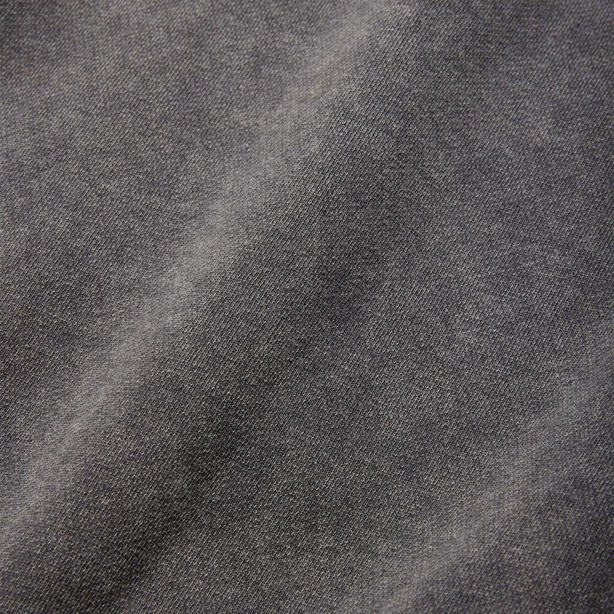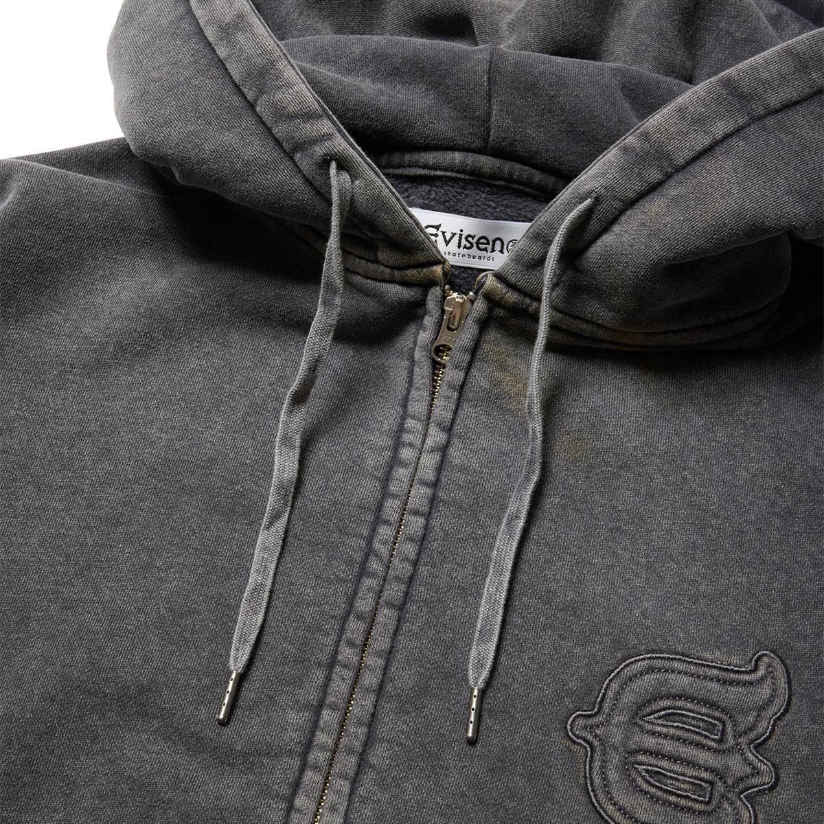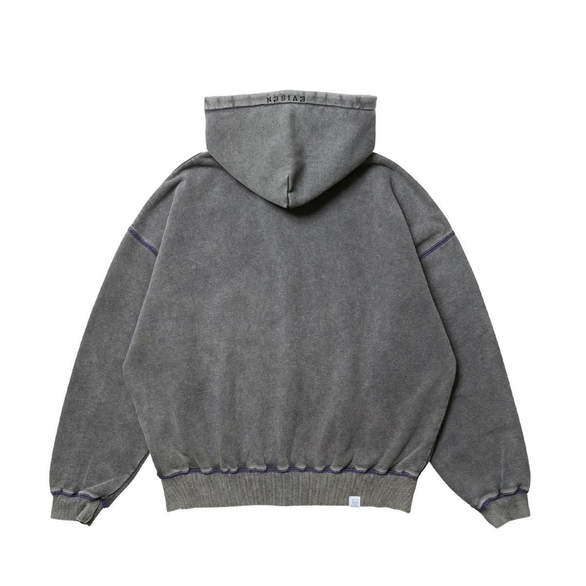 フロントオープニングはダブルファスナー仕様。左胸にEロゴのスウェットパッチ、フロントにカンガルーポケットを配置。