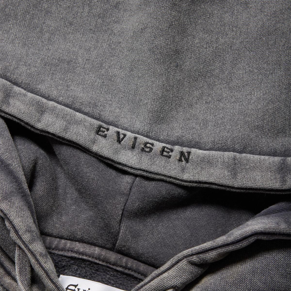 生地に独特な表情が出るスノーウォッシュ加工で仕上げました。 スピンドルコード入りフードの額部分にはEVISENの刺繍入り。