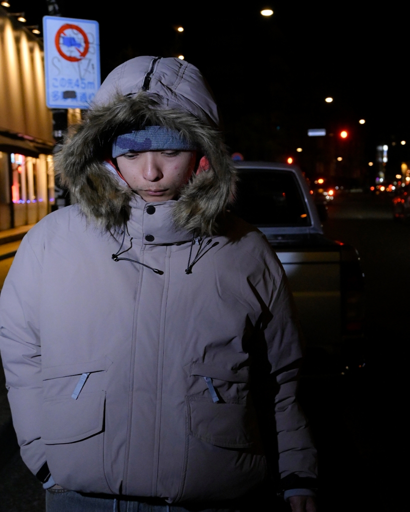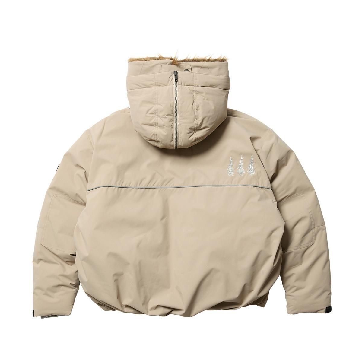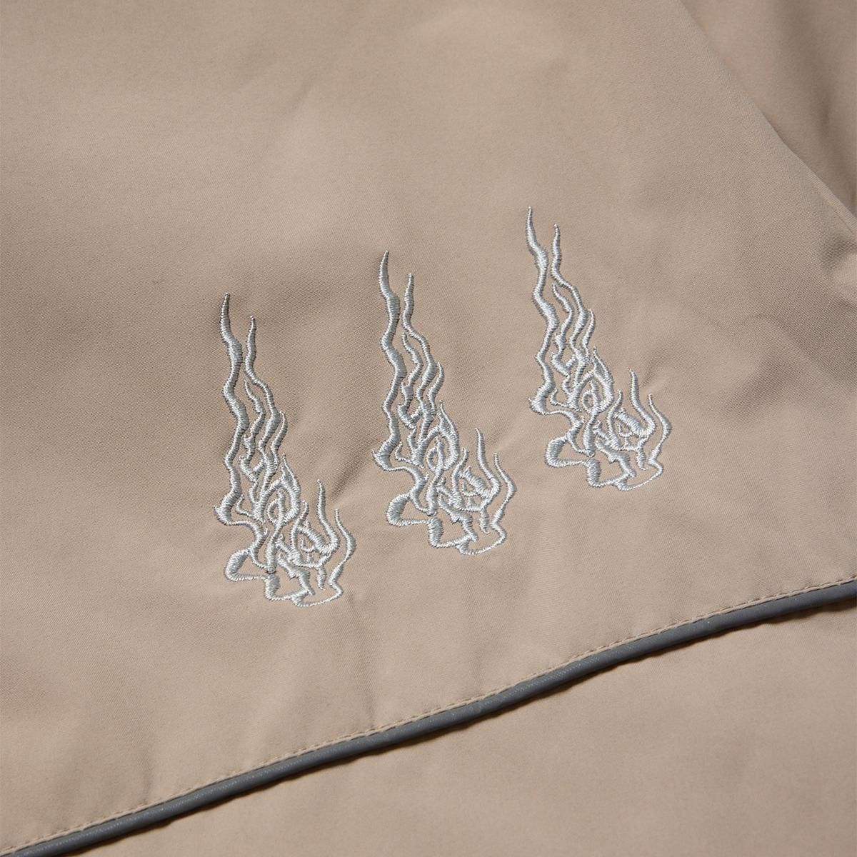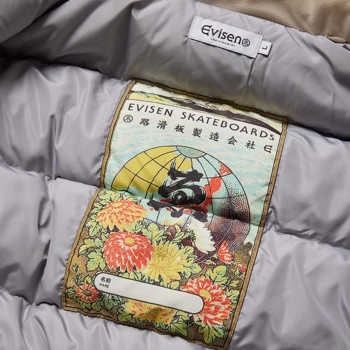 ファスナーと隠しマグネットで着脱可能なフードの仕様により、違った印象で着こなせるあったかダウンジャケット。ファスナーでフード全体を取り外しできるほか、フード部分を付けたままセンターファスナーでフラットにすることも可能。フード内側にフリース素材を使用しているためあったかさもひとしお。フード縁のフェイクファーパーツも取り外し可能で、フードを外した場合はスタンドカラーのジャケットになります。表地は、薄く軽量ながら耐久性が高く濡れても乾きやすいテトロン生地を使用。フロントオープニングは比翼仕立てのスナップボタンとダブルファスナーの仕様。フロントにファスナーポケットとマグネット付きフラップポケットのほか、便利なインナーポケットも搭載。右側フラップポケットにはEvisenメタルプレート付き。背中のヨーク部分にはリフレクター素材のパイピングライン入りで、ラインの左上にEyeFireグラフィックをプリント。スリーブにはロゴ入りシリコンパッチとエルボーパッチを配置し、袖口は風を通しにくいリブパーツ付きの二重構造で、ベルクロアジャスター付き。裾にはドローコード入りでフィット感の調整が可能。裏地の背面には名前も書けちゃうGlobe Labelグラフィックをプリントした大判のパッチ付き。スケーターでもスケータじゃなくても、寒さに挑む全ての人に温かいジャケットです。